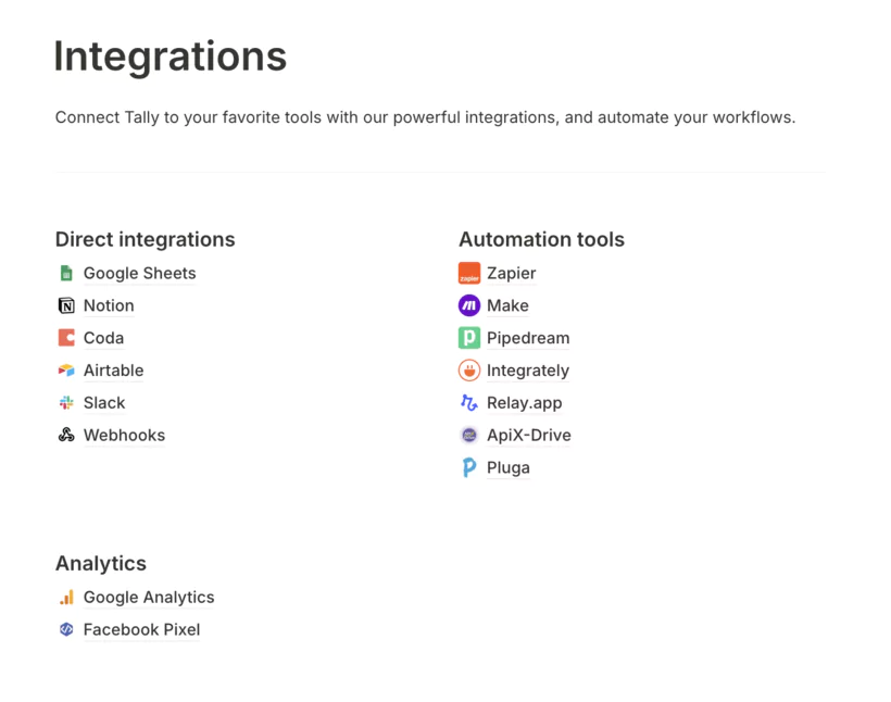 Tally helps with data-driven decision-making through its integrated analysis tools. This platform stands out for its unmatched generosity with unlimited free forms, a modern Notion-inspired interface, and a massive integration ecosystem.