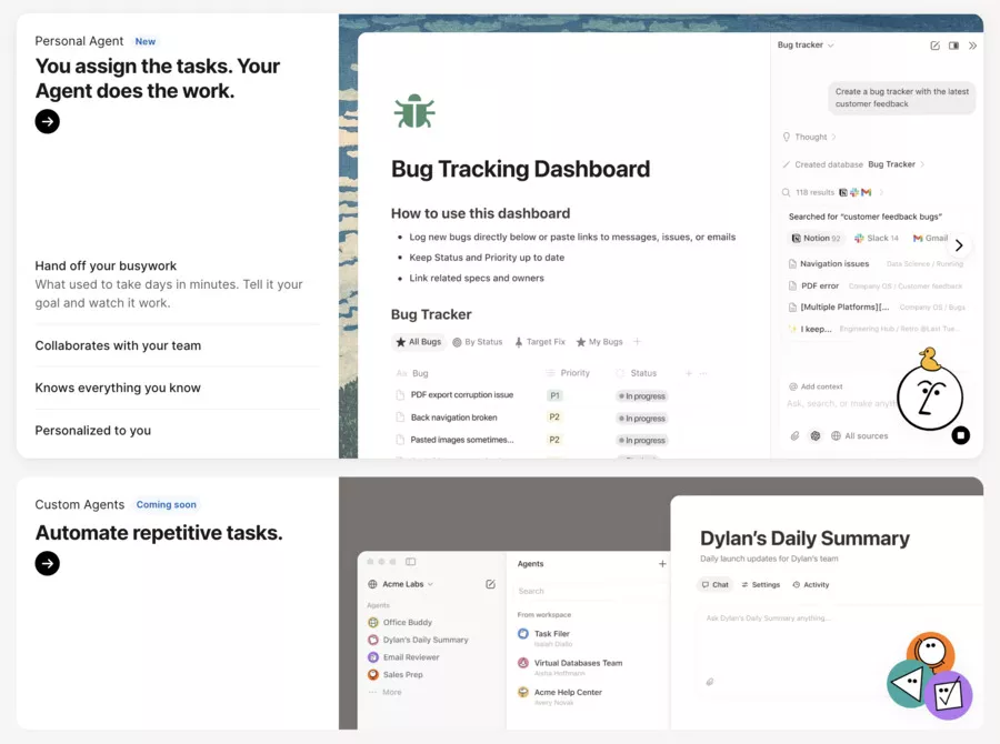 On the innovation front, Notion AI is a game-changer: it instantly answers your questions, summarizes documents, creates templates, and helps structure databases. Powerful search filters let you find any information across your entire workspace — in a flash.