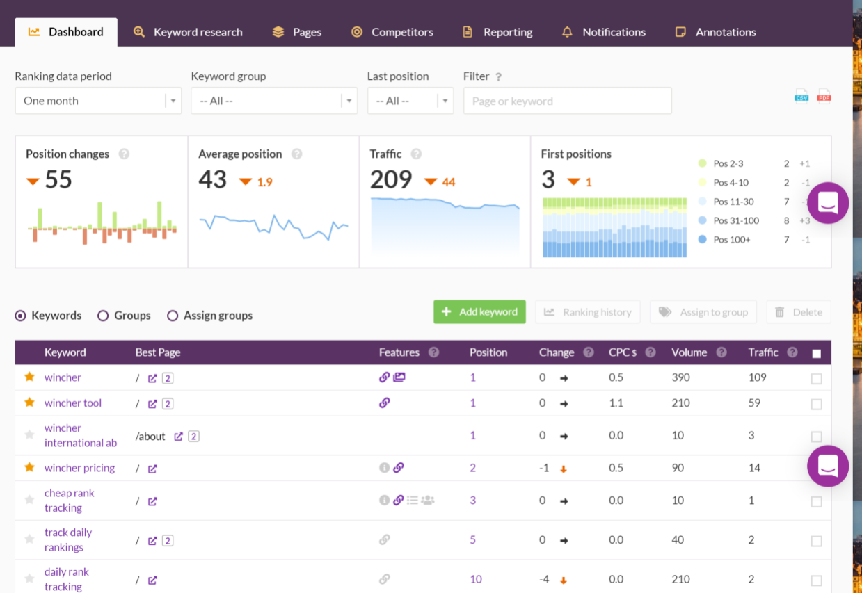Wincher is one of the few ranking tracking tools that stands out from the rest. It's designed specifically to track page rankings for targeted keywords, and it's one of the most affordable options available. It also comes with lots of valuable tools for competitive analysis, automatic alerts, daily ranking updates, and much more.