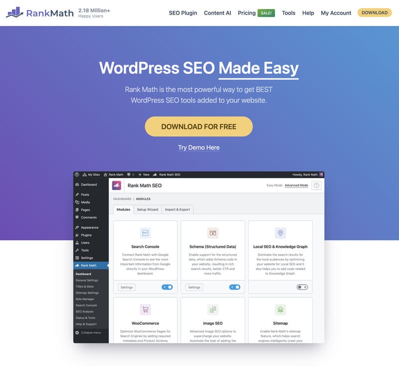 Rank Math is an SEO plugin for WordPress that offers an advanced optimization experience. Thanks to its ease of use and extensive functionality, it quickly became a popular choice among WordPress users.