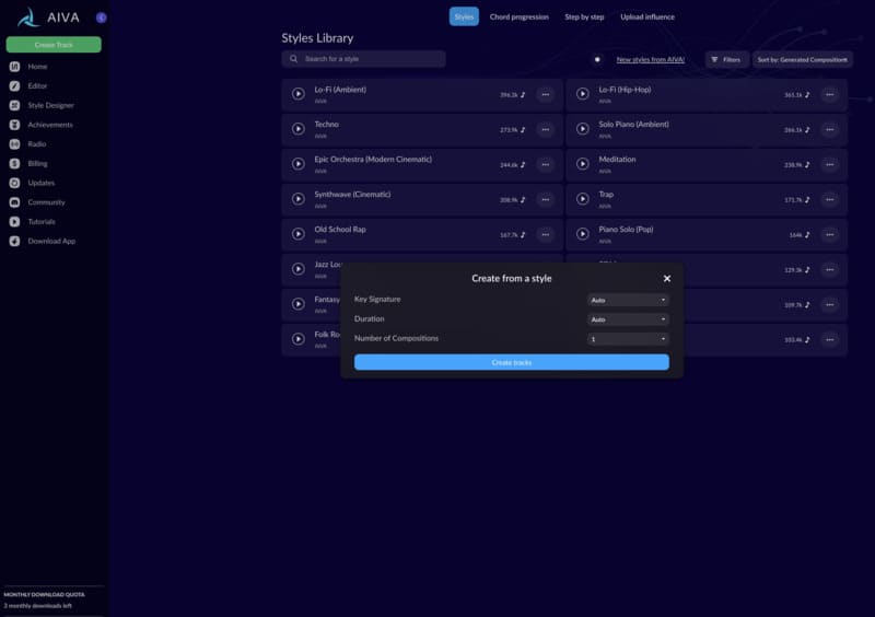 AIVA dispose d'une vaste bibliothèque de genres et de styles musicaux.