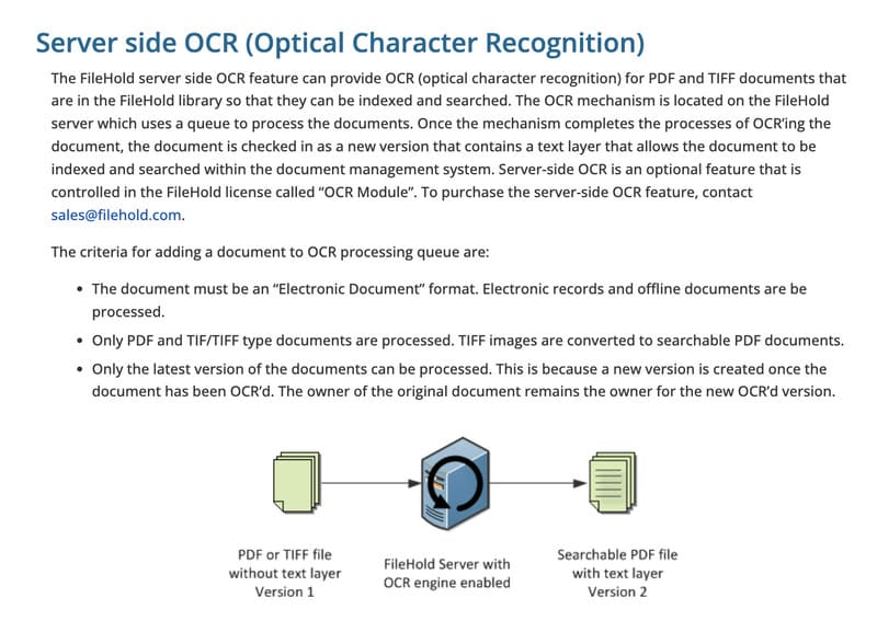 La conversion de documents en fichiers OCR lisibles est l'une des fonctionnalités les plus puissantes de Filehold. Pour en savoir plus, consultez la page OCR (Optical Character Recognition) côté serveur.