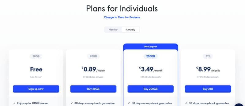- Abonnement Premium : Offre plus d'espace de stockage et des fonctionnalités supplémentaires, tarifs à partir de 1 €/mois pour 150 Go.