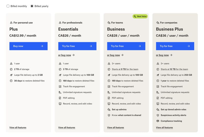 Les trois premiers niveaux sur Google Drive peuvent être payés mensuellement ou annuellement, à partir de 1,99 dollar par mois pour 100 Go, 2,99 dollars par mois pour 200 Go et 9,99 dollars pour 2 To. Le stockage fait ensuite un bond significatif, mais le prix aussi. Les utilisateurs devront débourser 99,99 dollars par mois pour 10 To, 199,99 dollars par mois pour 20 To et 299,99 dollars par mois pour 30 To. Bien que les besoins de stockage augmentent avec les vidéos en résolution 4K+, l'option 2 To offre certainement le meilleur rapport qualité-prix.