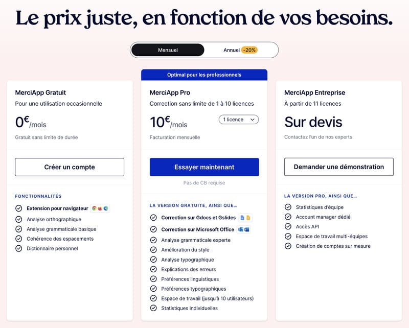 Choisissez le correcteur d’orthographe MerciApp parfait pour vos besoins, en un coup d'œil.