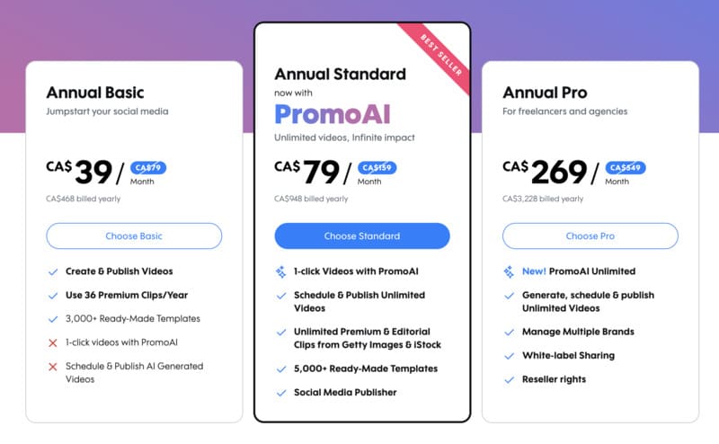 En résumé, Promo.com offre trois niveaux de plans tarifaires, chacun augmentant en fonctionnalités et en accès aux ressources premium. Que vous soyez un utilisateur de base ou un professionnel, ces plans offrent une flexibilité pour répondre à divers besoins de création vidéo.