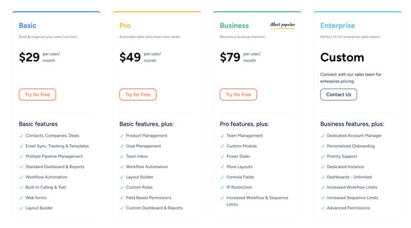 Salesmate propose différents forfaits tarifaires mensuels et annuels, adaptés à divers besoins d'entreprise. Chaque tarif est facturé par utilisateur.
