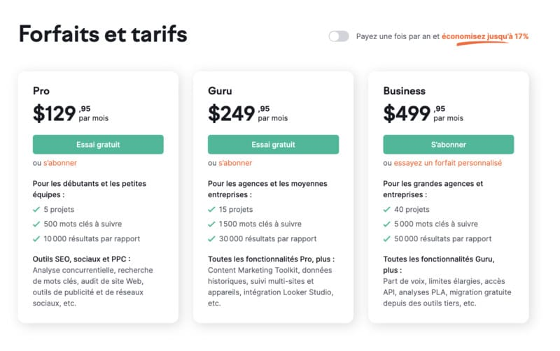 - Advanced : 399 $/mois pour experts en référencement et grandes équipes.