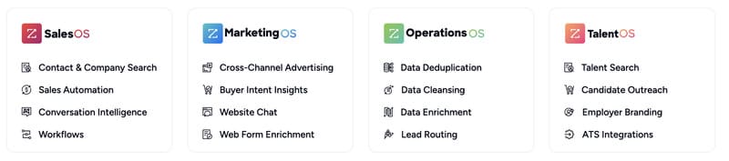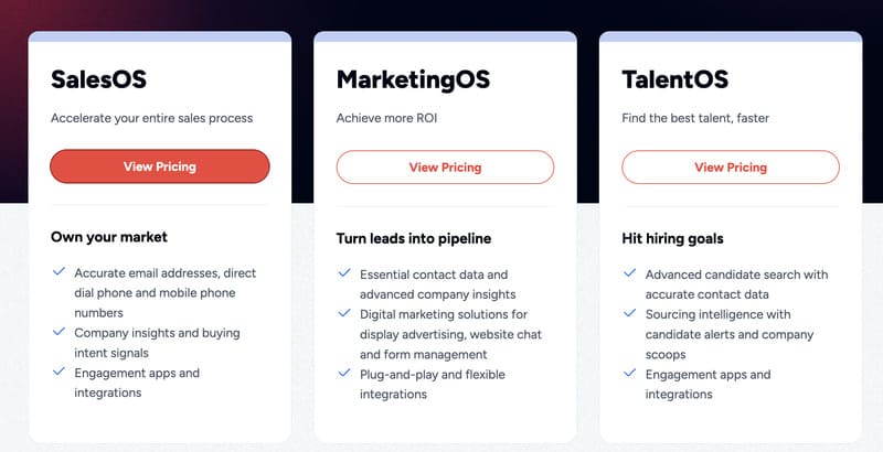 ZoomInfo propose trois packs principaux, chacun conçu pour dynamiser un aspect différent de votre entreprise, de la vente au marketing en passant par le recrutement.