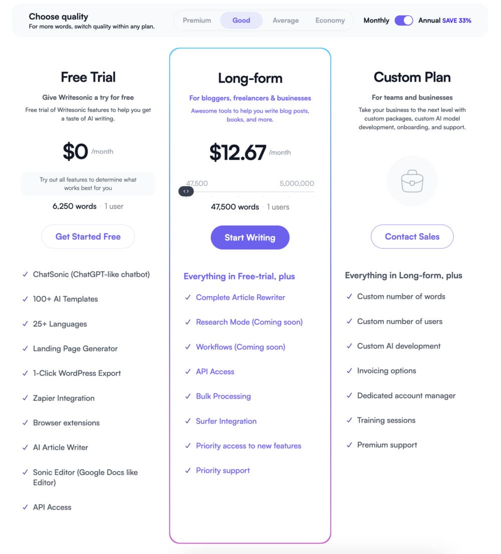 Le tarif démarre à 12.67 $ par mois en fonction de votre niveau d'utilisation basé sur le nombre de mots créés.