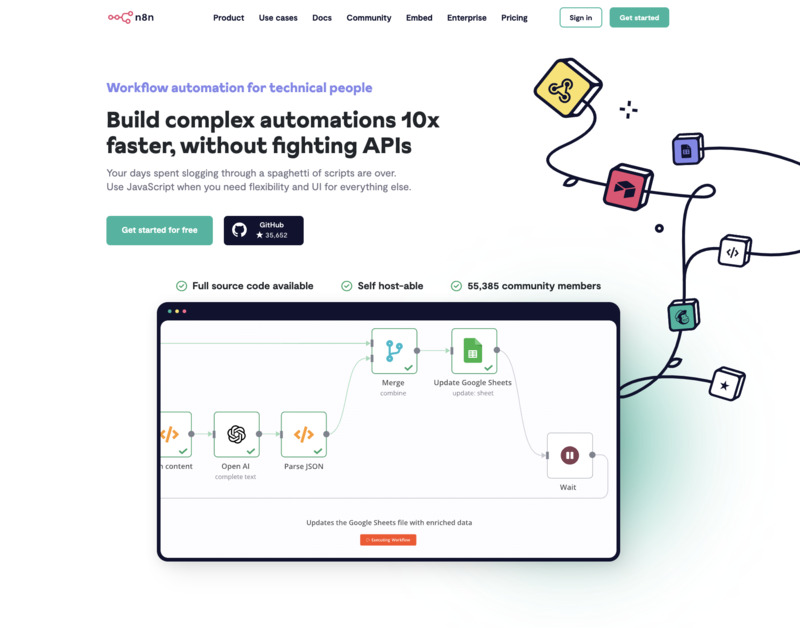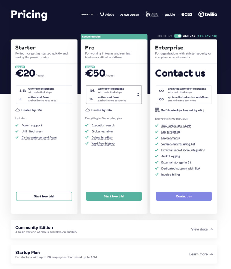 n8n est idéal pour ses facilités d'utilisation et d'intégration, avec des options allant d'une version communautaire gratuite à des plans cloud plus robustes pour les entreprises nécessitant des fonctionnalités avancées et une sécurité renforcée.