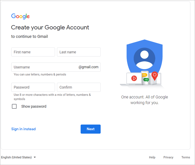 Pour créer un compte Gmail, il suffit de se rendre sur la page de création de compte Google et de remplir le formulaire en y renseignant notamment son nom, son prénom, une adresse e-mail et un mot de passe.